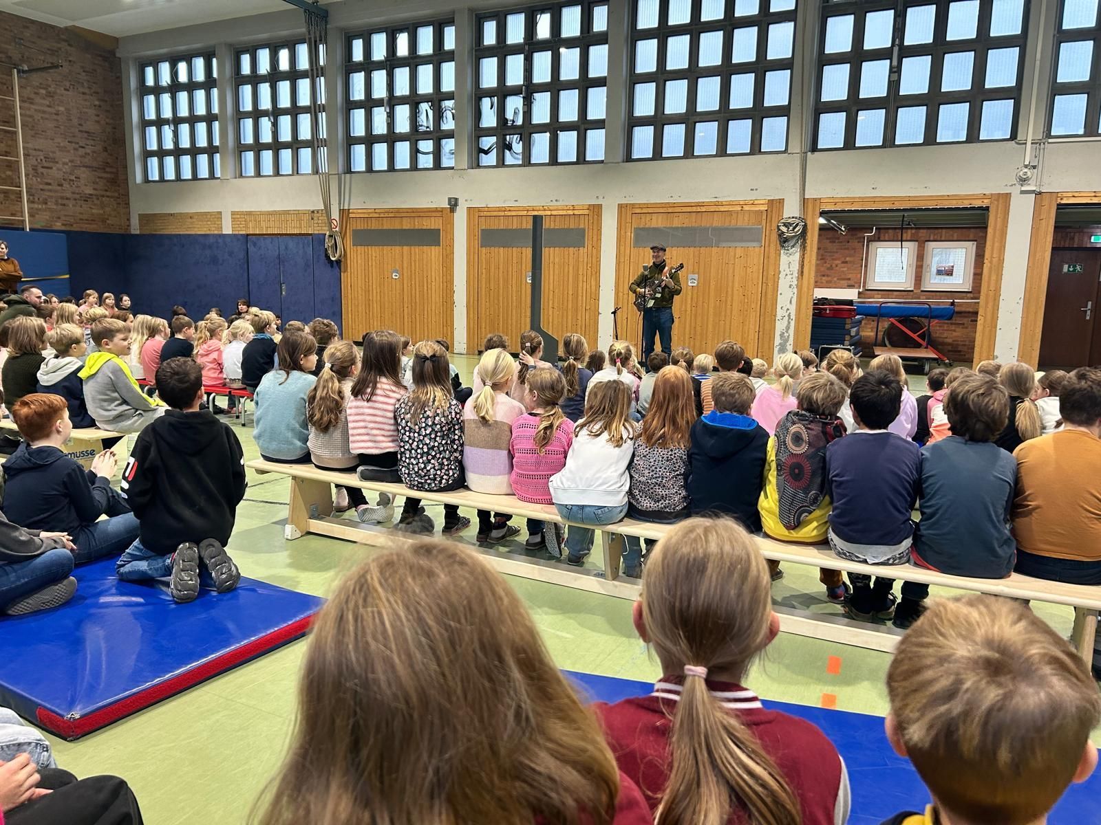 "Am 15. November wird vorgelesen." Unter diesem Motto wird einmal im Jahr ein besonderes Zeichen für die Bedeutung des Vorlesens gesetzt. Die Olpketalschule lud zu diesem Anlass einen ganz besonderen Gast zu sich ein, der Musik und Literatur miteinander verknüpft: Oliver Steller. Gemeinsam mit seiner silbernen Gitarre namens Frieda verzauberte er die Olpis, die sich alle in der großen Turnhalle versammelt hatten. Und "zaubern" ist in diesem Fall wörtlich zu nehmen: Er ließ ein rotes Taschentuch verschwinden, ebenso wie die Seiten eines Malbuches, präsentierte Zungenbrecher in atemberaubender Geschwindigkeit und brachte die Kinder mit Gedichten über den Fisch namens Fasch und Liedern über verschwundene Spinnen und ungezogene Opas zum Lachen. Aber auch die Kinder selbst durften ihr Können präsentieren und neben lautem Mitsingen auch eigene Zungenbrecher vortragen. Diesen besonderen Vorlesetag werden die Olpis nicht so schnell wieder vergessen.